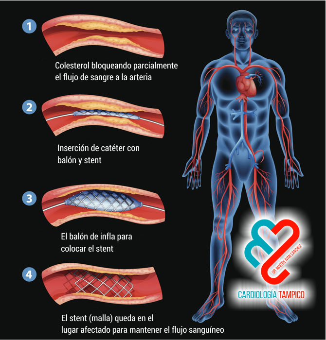 El stent es una malla metálica de forma tubular. Cuando se implanta un stent dentro de una arteria coronaria, éste actúa como un soporte o armazón para mantener abierto el vaso sanguíneo. El stent, al mantener abierto el vaso, contribuye a mejorar el flujo de sangre al músculo cardíaco y a reducir el dolor de la angina de pecho. Los procedimientos de colocación de stent generalmente se realizan junto con una angioplastia con balón. De hecho, alrededor del 80 por ciento de los pacientes que se someten a una angioplastia con balón también reciben un stent.